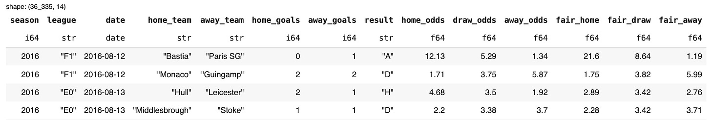 The odds data comes from Joseph Buchdahl’s football-data.co.uk, as usual. For market prices, we take Pinnacle closing odds, because: If your system consistently beats Pinnacle’s closing price, you almost certainly have an edge.