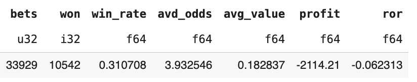 Across these bets, the average perceived value was around +18.2% (that’s a lot), and the system achieved a 31% win rate.