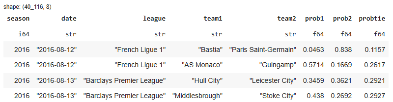 From these probabilities we’ll compute fair odds simply by taking the inverse. For example, SPI gave Bastia a 4.63% chance of beating PSG in the opening match of 2016/17. The corresponding odds according to FiveThirtyEight are therefore 1 / 0.0463 = 21.6 which means that if you bet 1€ on that outcome, you would have won a total of 21.6€ back (in case if a winning wager of course).