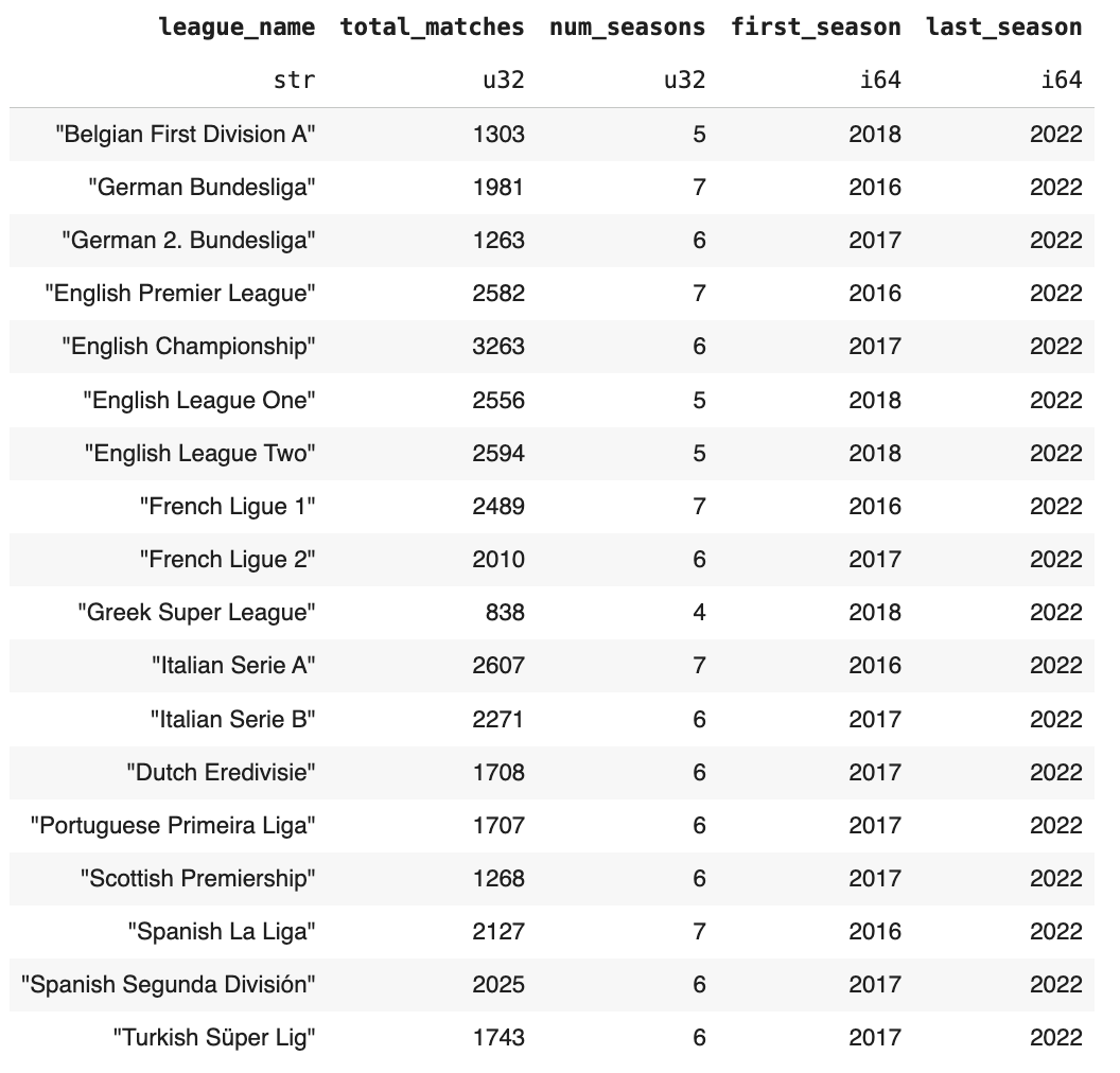 To analyse profitability, I then needed the market odds for each match. Based on ease of downloading, I downloaded the market odds for 18 of those 40 leagues (my newsletter, my rules), which is still a very healthy sample.