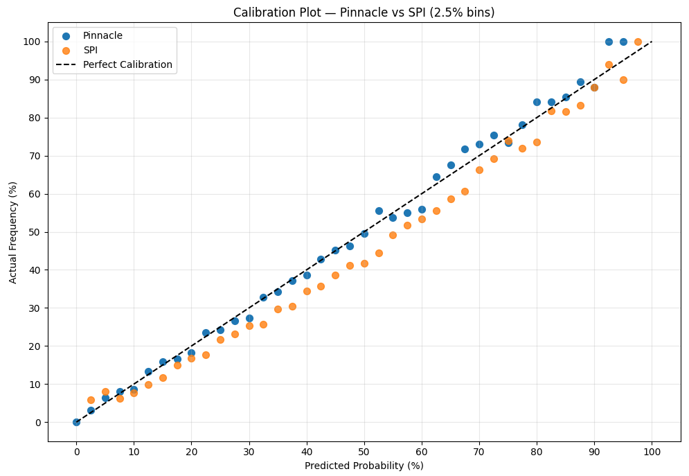 Having said that, here’s how SPI’s predicted probabilities fared against the actual results. In the chart below, we compare SPI’s probabilities to those implied by Pinnacle’s closing odds, and we check how well each aligns with reality.