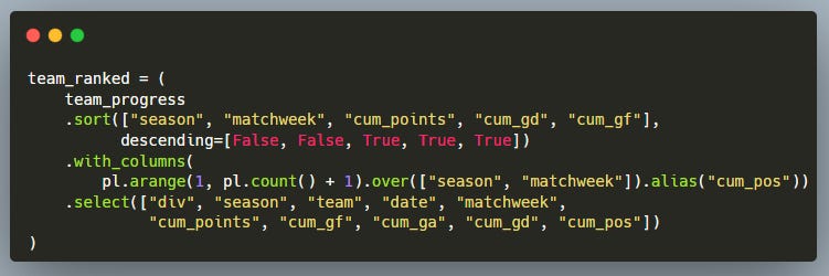 Based on the interim values for points accumulated, goals for, goals against, and goal difference, we create each team’s position for every matchweek. We do this by sorting first by points, then by goal difference, and finally by goals for.