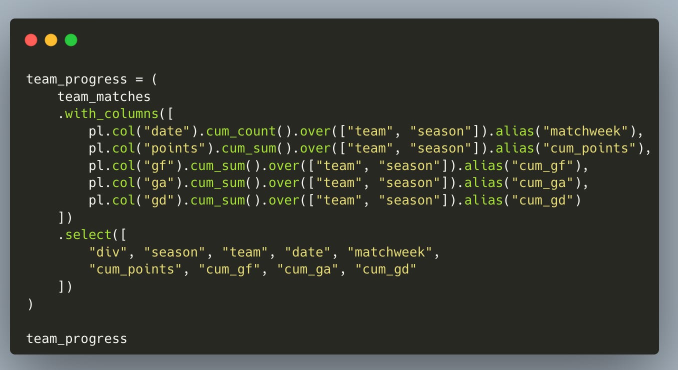 This produces a tidy table showing, for every team in every season, how their totals evolve after each matchweek.