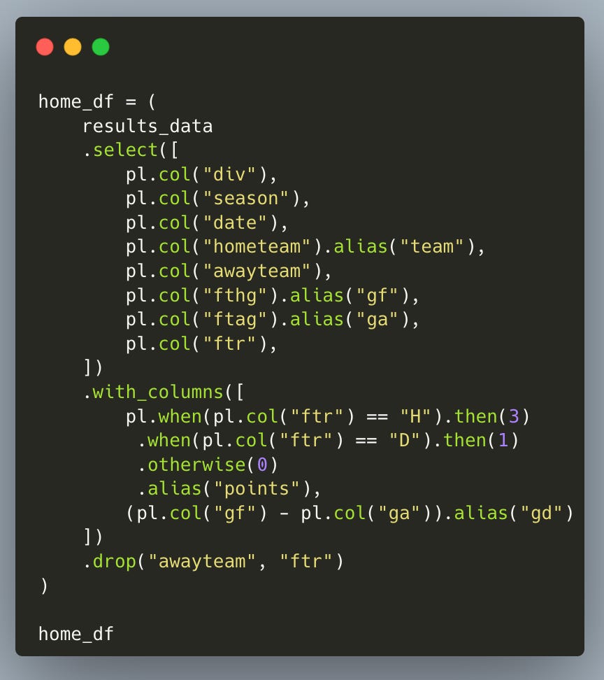 Next, we build the team-level data. For each home team, we calculate their goals for, goals against, points won, and goal difference.