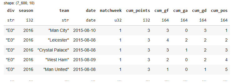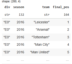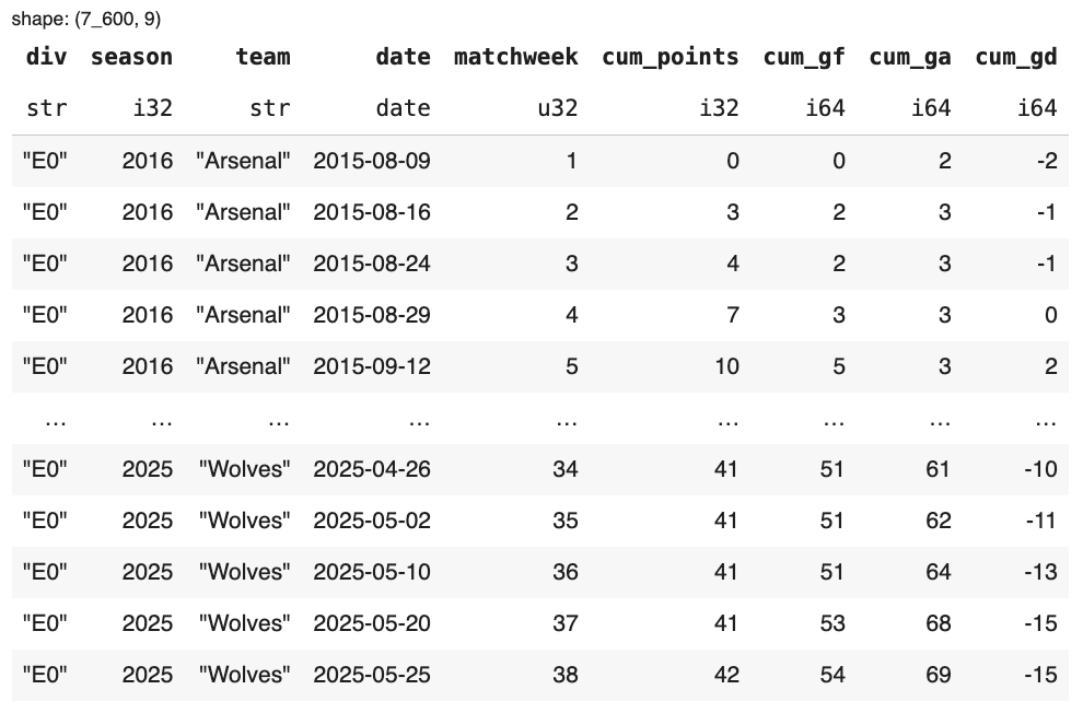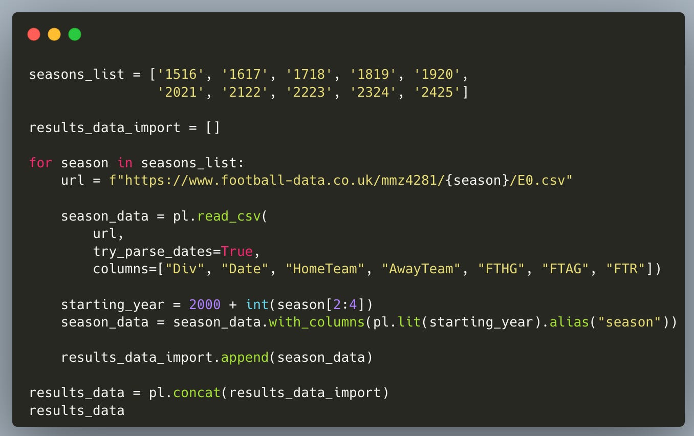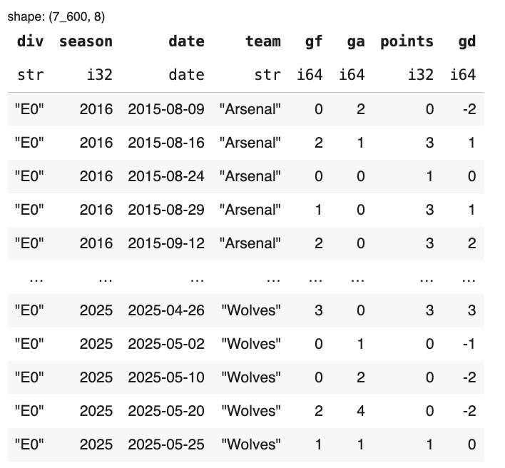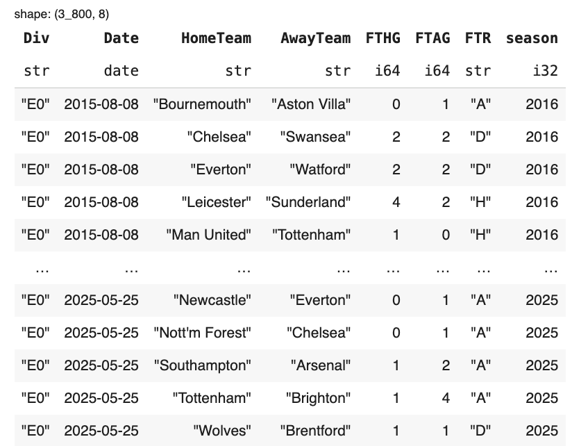 We’ll collect 10 seasons of Premier League results from Joseph Buchdahl’s Football-Data.co.uk — a fantastic open resource with historical match CSVs. With Polars’ read_csv, we can load them directly.