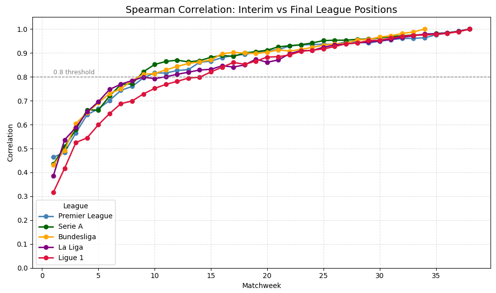 Serie A and the Bundesliga are the earliest to stabilise among the Big 5, passing the 0.8 threshold at Matchweek 9 — though La Liga and the Premier League aren’t far behind.