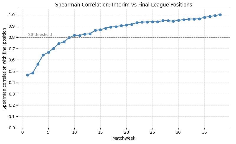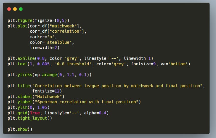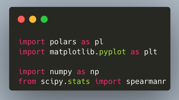 First, we import the libraries we’ll use. Polars for fast, readable wrangling. NumPy for small numeric utilities. Matplotlib for plotting. And SciPy’s spearmanr to compute the Spearman rank correlations between interim and final league positions.