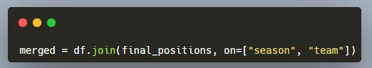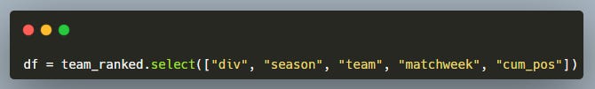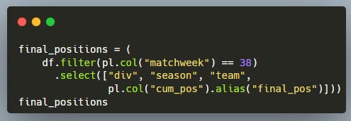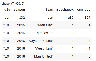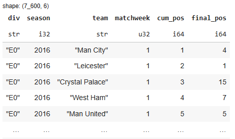 Then we create a final positions table by keeping only the last matchweek of each season — these are the official final ranks.