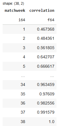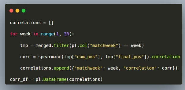 Next, we compute the correlation for each matchweek. The loop: