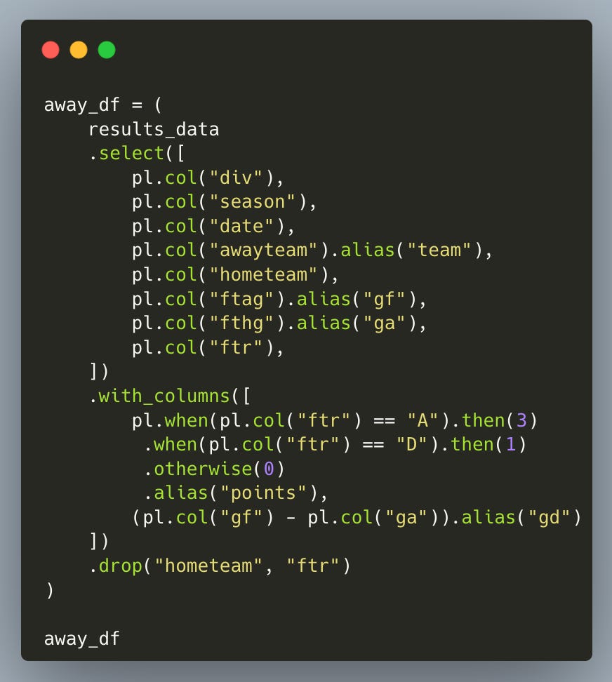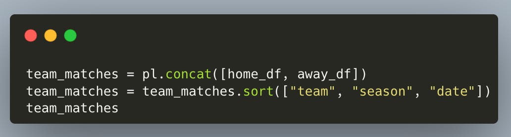 And now we have one row per team per match, containing that team’s goals for, goals against, points earned, and goal difference.