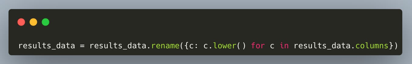 We start by renaming all columns to lowercase.