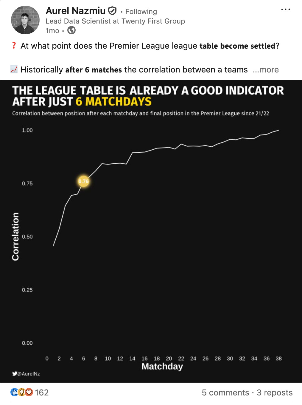 A few weeks back, Aurel Nazmiu shared a great visual showing when the Premier League table stabilises during the season.