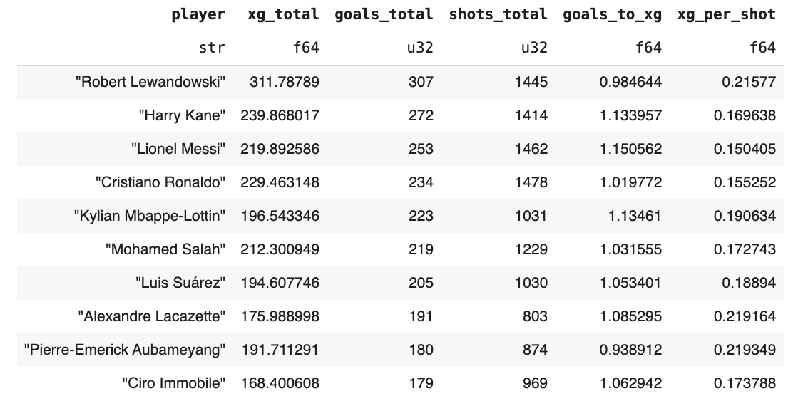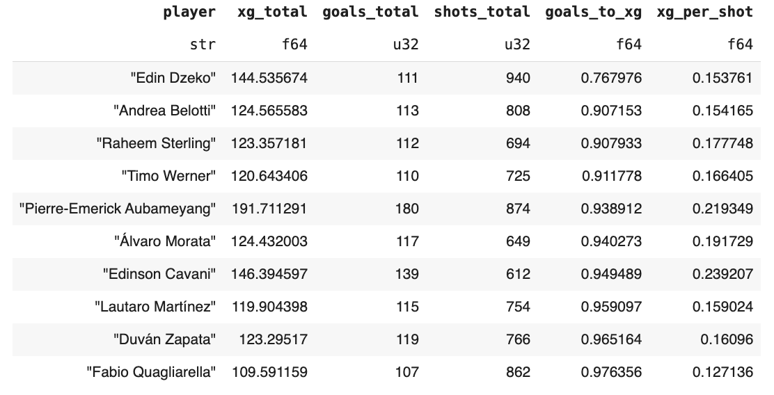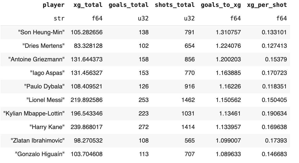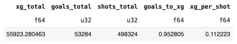 (pl.col("goals_total")/pl.col("xg_total")).alias("goals_to_xg"), (pl.col("xg_total")/pl.col("shots_total")).alias("xg_per_shot"))