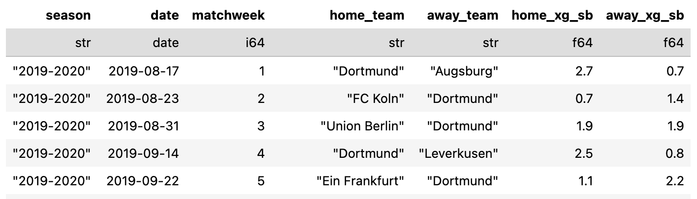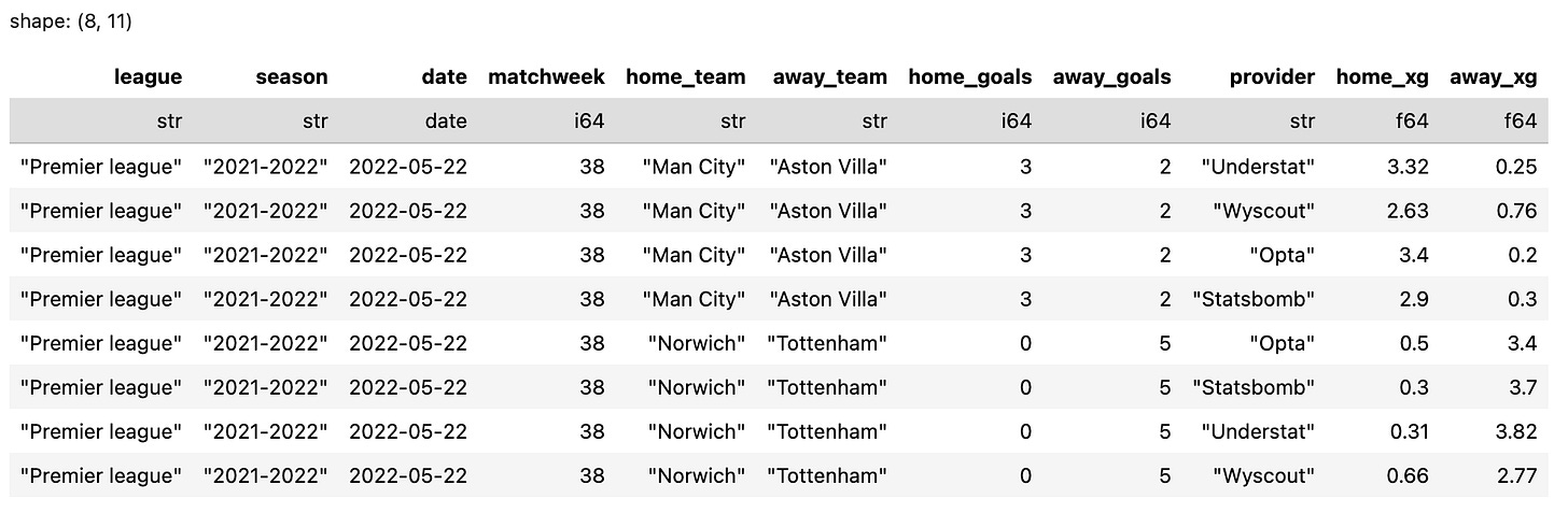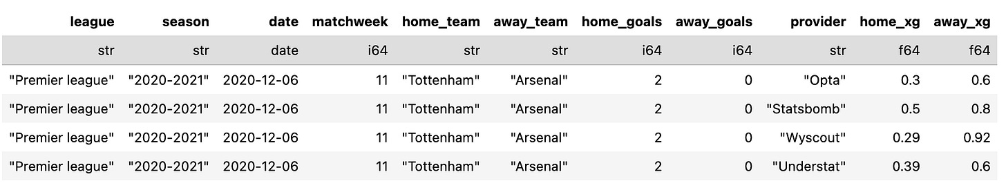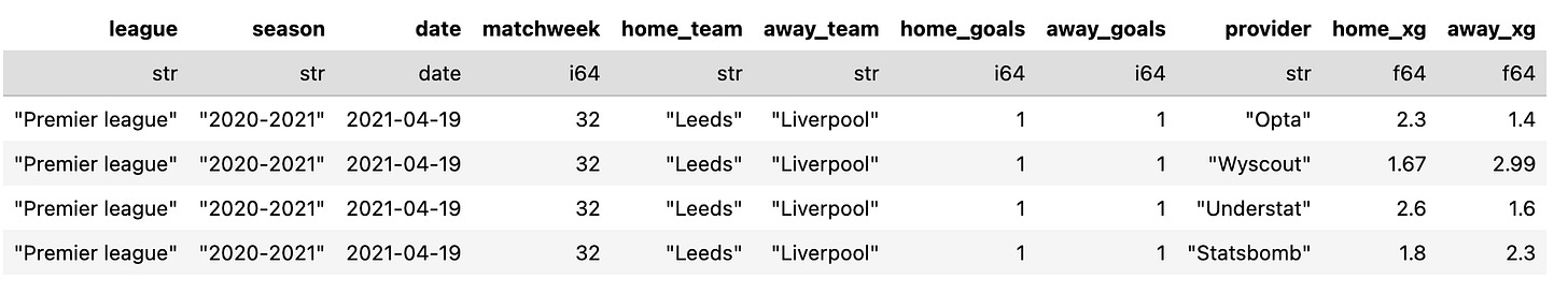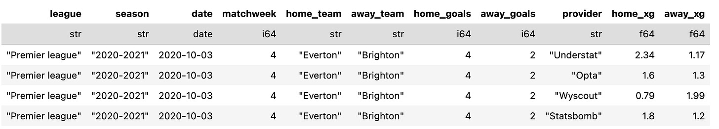 For every game, the dataset includes the full-time xG scoreline from four sources: Opta, StatsBomb, Wyscout and Understat. Here’s a quick look at the structure of the dataset: