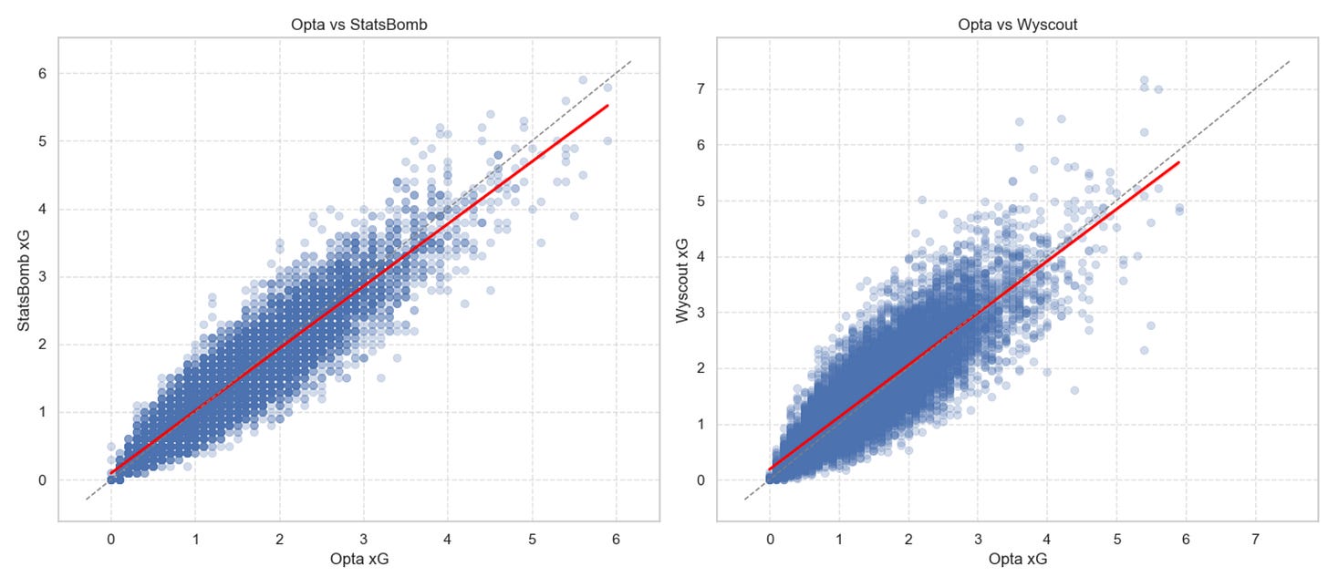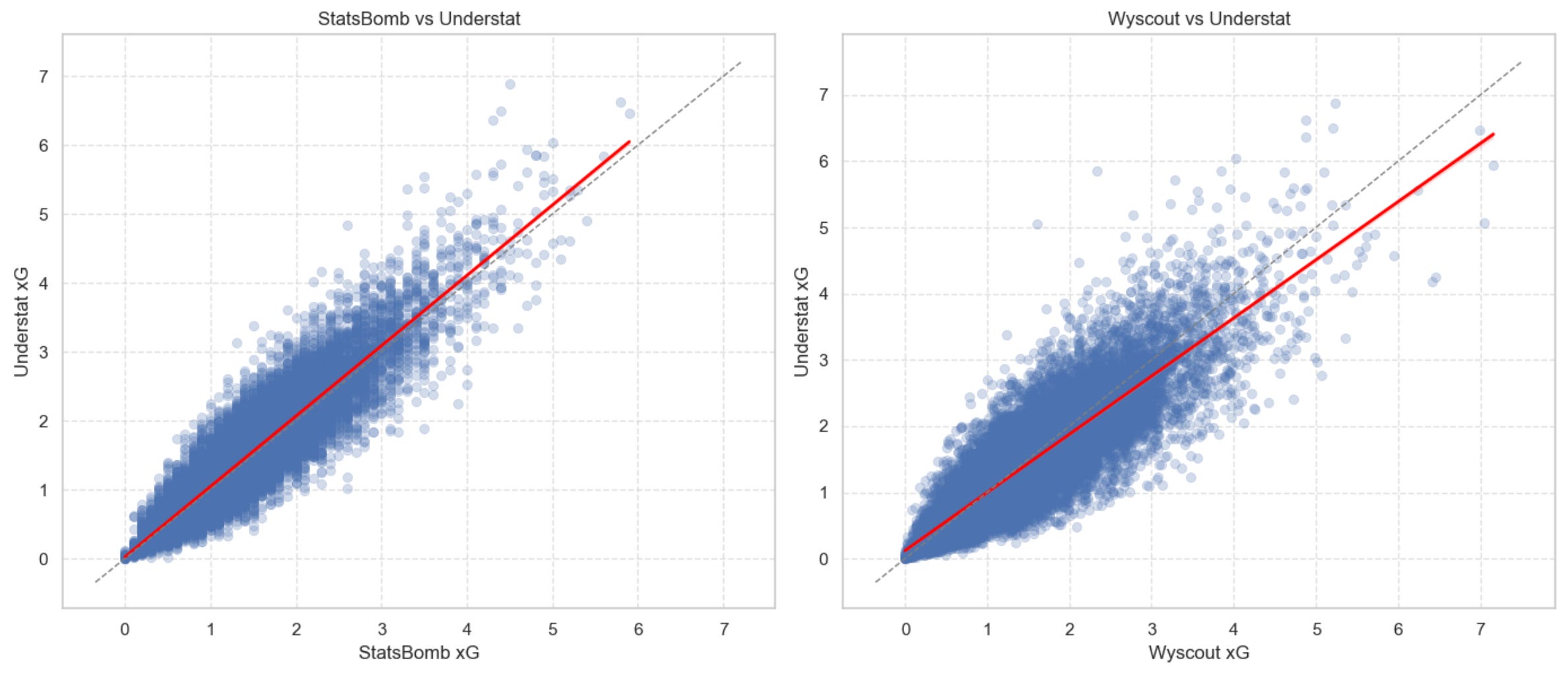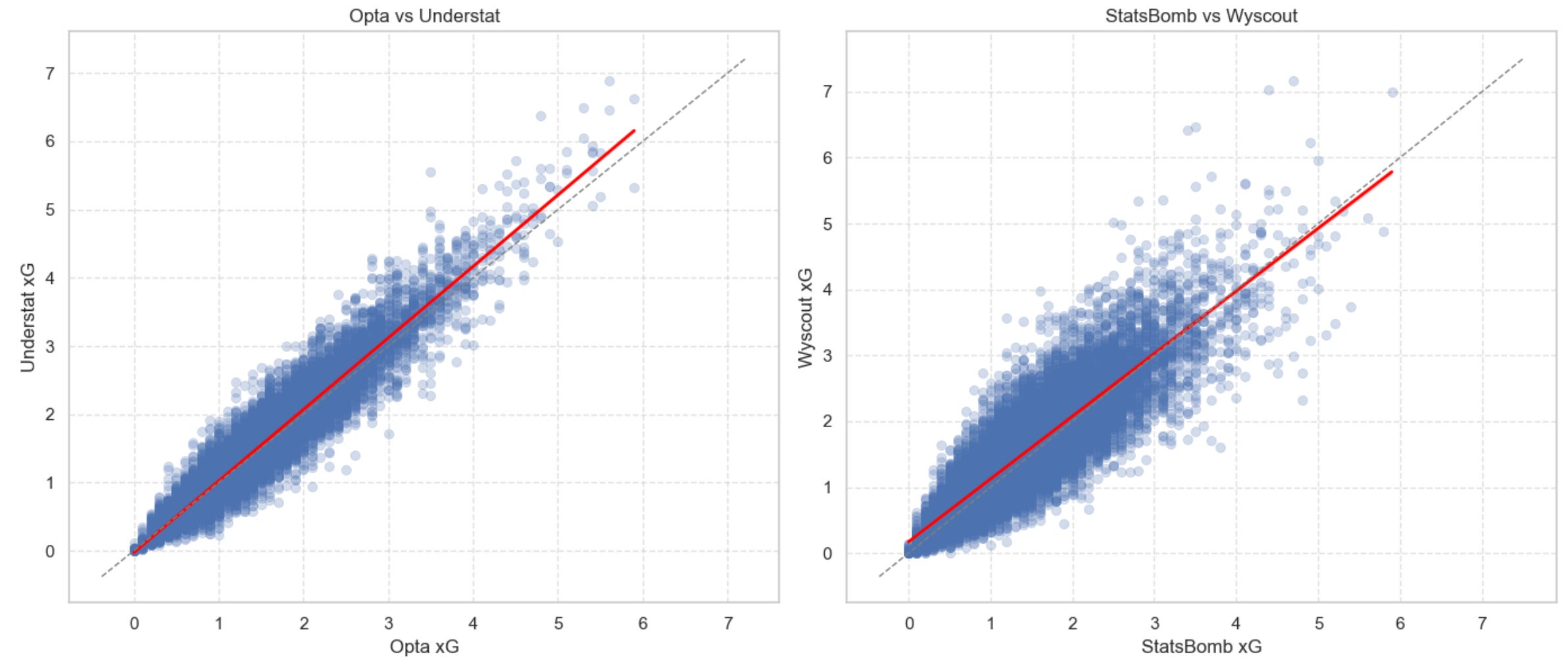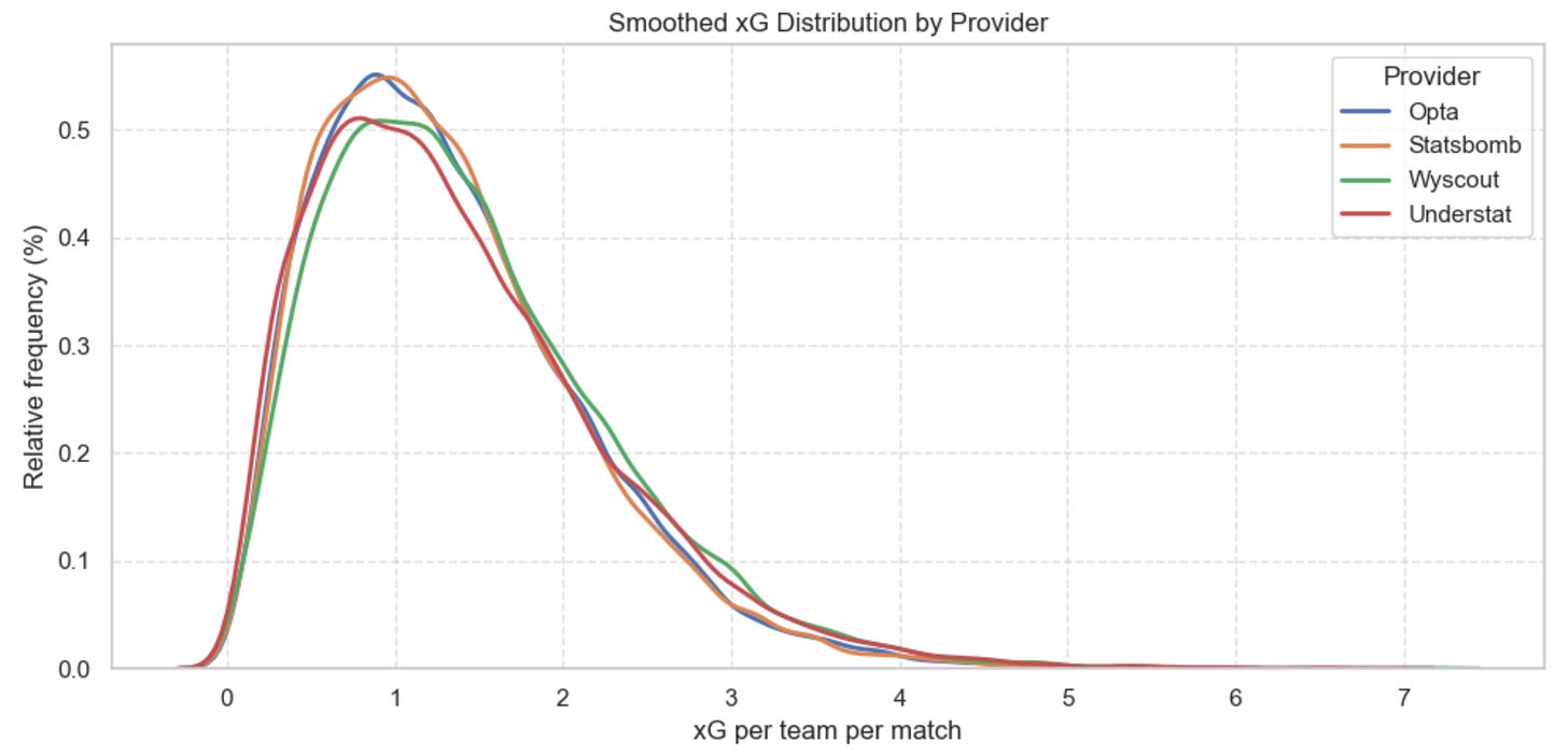 The four sources were extracted at different points in time: StatsBomb → May 2022, Wyscout → October 2022, Opta → May 2023, Understat → November 2025. I mention this because some providers occasionally retro-update past xG values (more on that in the end). If any discrepancies show up, timing could be part of the explanation.