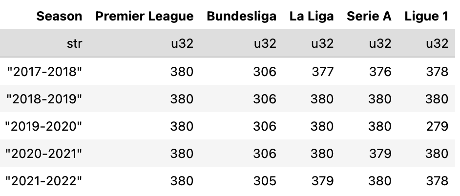 For this edition, we’re working with five full seasons of matches (2017/18 to 2021/22) across the Premier League, Bundesliga, Serie A, La Liga and Ligue 1.