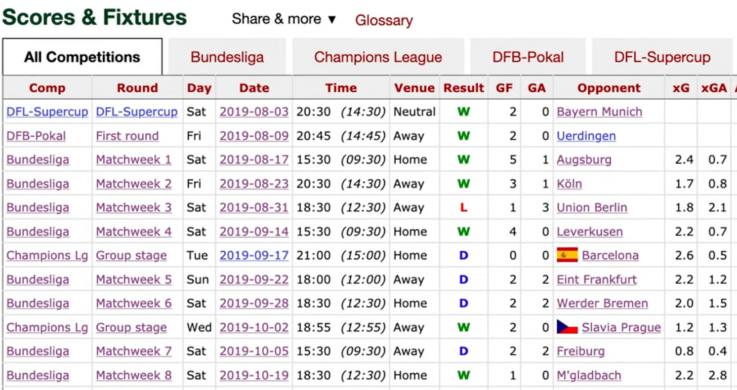 I had a hard time finding another source of StatsBomb match-level data, so I scoured the internet and eventually stumbled upon a YouTube video dating back to April 2020 reviewing Statsbomb data (which at the time was hosted on Fbref) for Dortmund’s 2019/20 season.
