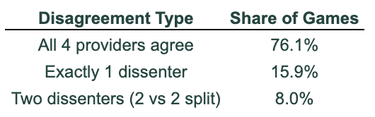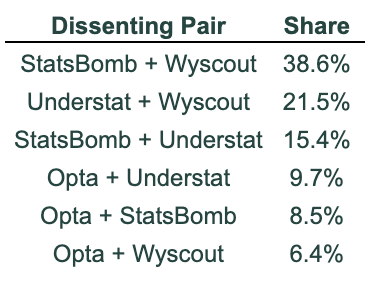 When exactly one model goes its own way, it’s overwhelmingly Wyscout with 45% of all 1-dissenter games. StatsBomb follows with 23% and then come Understat and Opta with 16%. No shock here — at this point in the newsletter, Wyscout consistently emerges as the “free spirit” of the group.