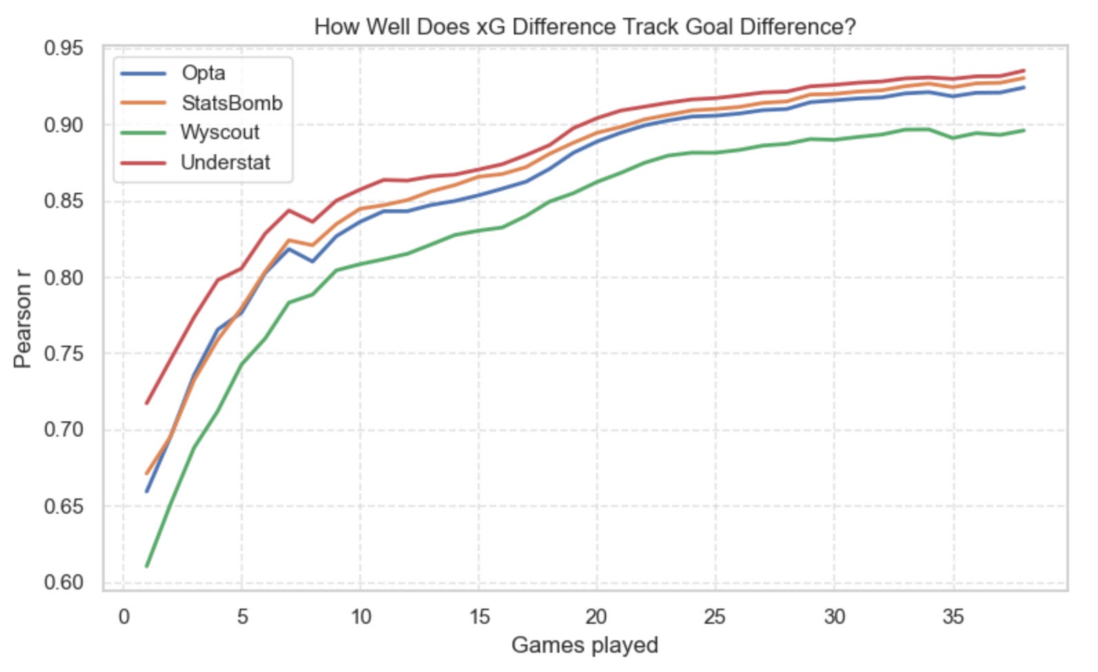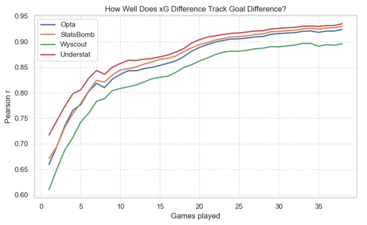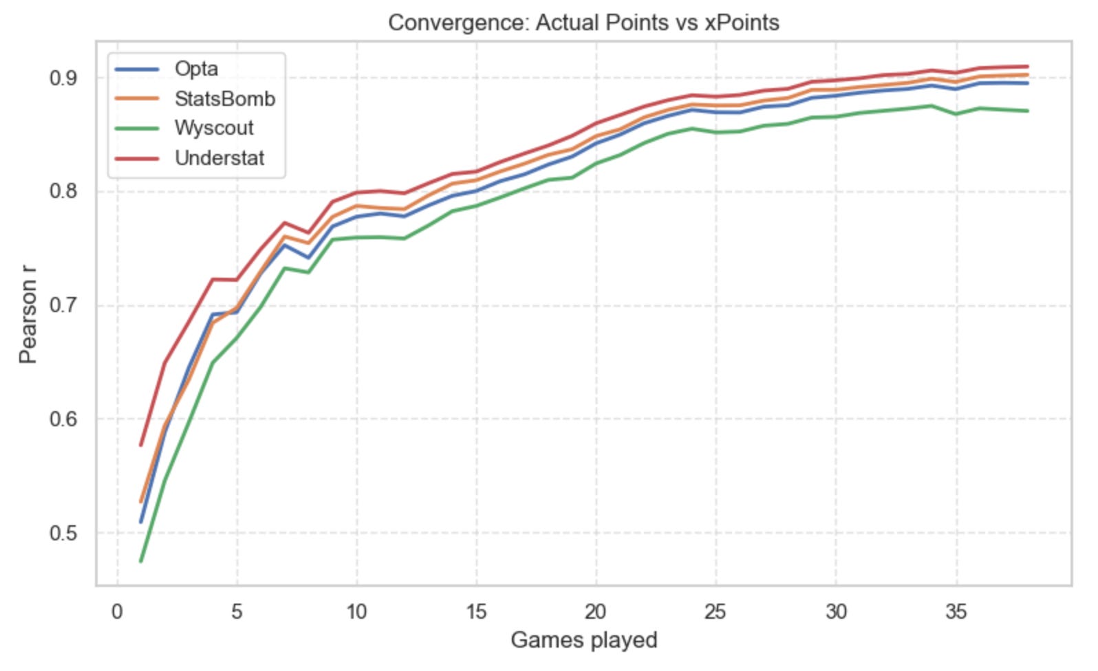This means that Understat’s xG model aligns with real results the fastest, despite being the only source here that isn’t a traditional data provider. Funny how this works.