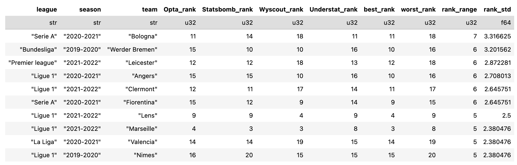 The standout case is Bologna (2020/21). Wyscout ranked them 18th, Opta and Understat both had them 11th, and StatsBomb put them 14th — a spread of 7 places, the biggest in the entire dataset.