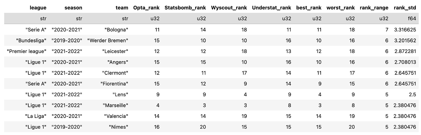 And as you’ll see across the top 10 cases, Wyscout tends to offer either the best or the worst ranking in these big-disagreement seasons.