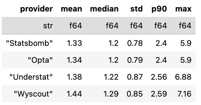 Before diving deeper, let’s look at some classic descriptive stats — the mean, median, standard deviation and maximum xG values across all teams, all games and all providers.