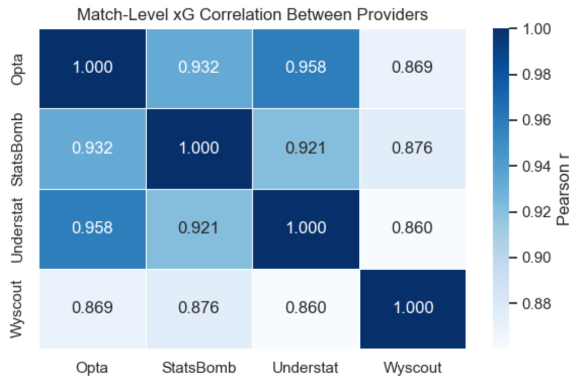 To complement the distribution plots, here’s a simple correlation matrix comparing each provider’s match-level xG values. Each number is a Pearson correlation: 1.00 means identical behaviour, lower values mean more disagreement.