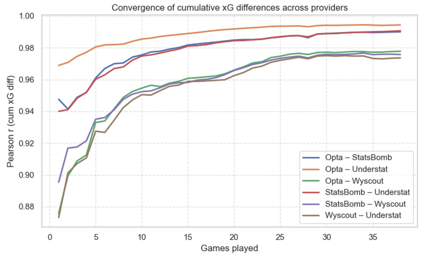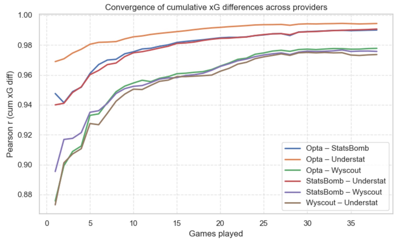 Each line shows (once more) the Pearson correlation (the one you first learned at school) between two providers’ cumulative xG differences at each match week. A value of 1.0 means the two providers generate identical season-long curves. A value of 0 means the curves have nothing in common. Put simply: the higher the line, the stronger the agreement.