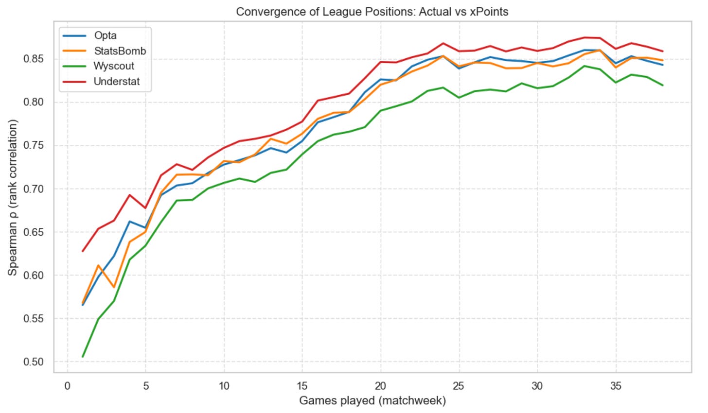 I was genuinely surprised to find that Understat consistently leads the pack when it comes to convergence to actual team performance — whether you look at points, rankings, or xG differences. It’s almost ironic: the only source in the comparison that isn’t a formal data provider ends up aligning with reality the fastest.